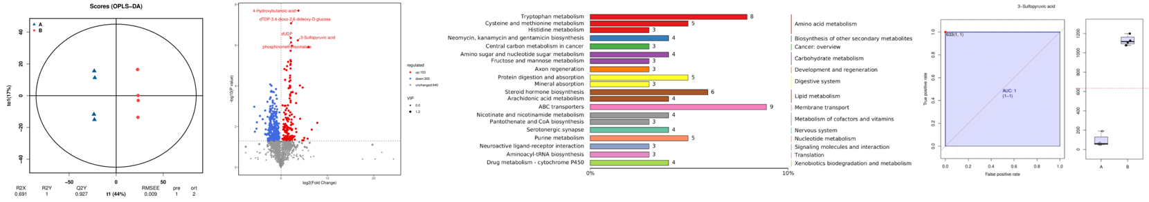(左から)Orthogonal partial least squares discriminant analysis (OPLS-DA), Differential metabolite volcano plot, Differential metabolite KEGG functional annotation and enrichment analysis, ROC curve analysis
